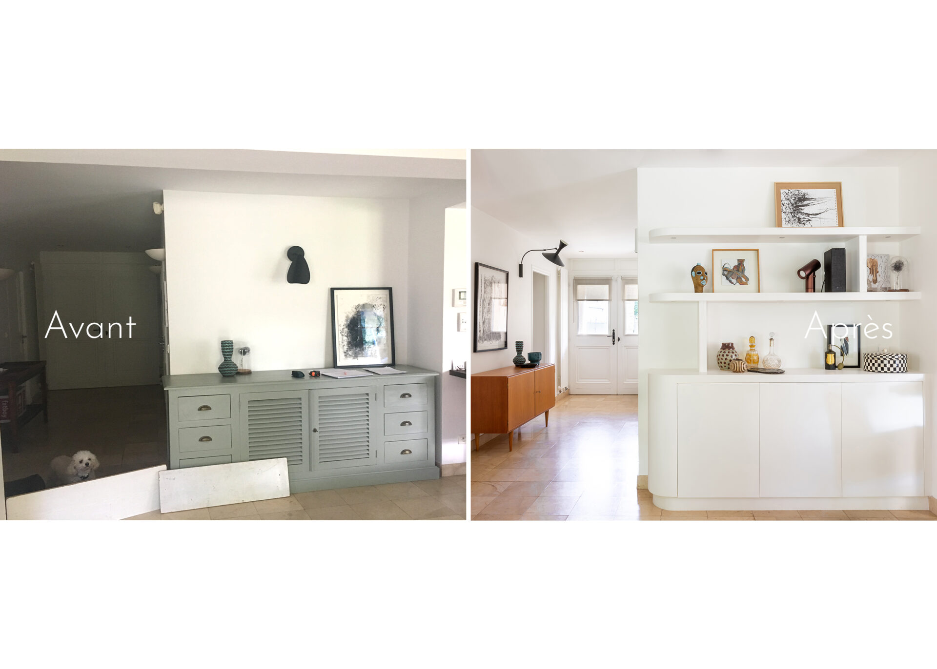 • réalisation d’une bibliothèque sur mesure (bibliothèque-buffet et bibliothèque-meuble TV)