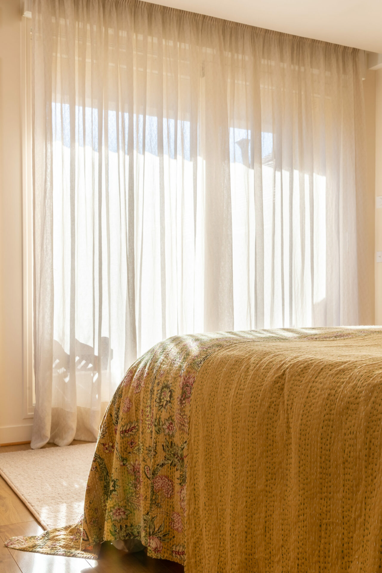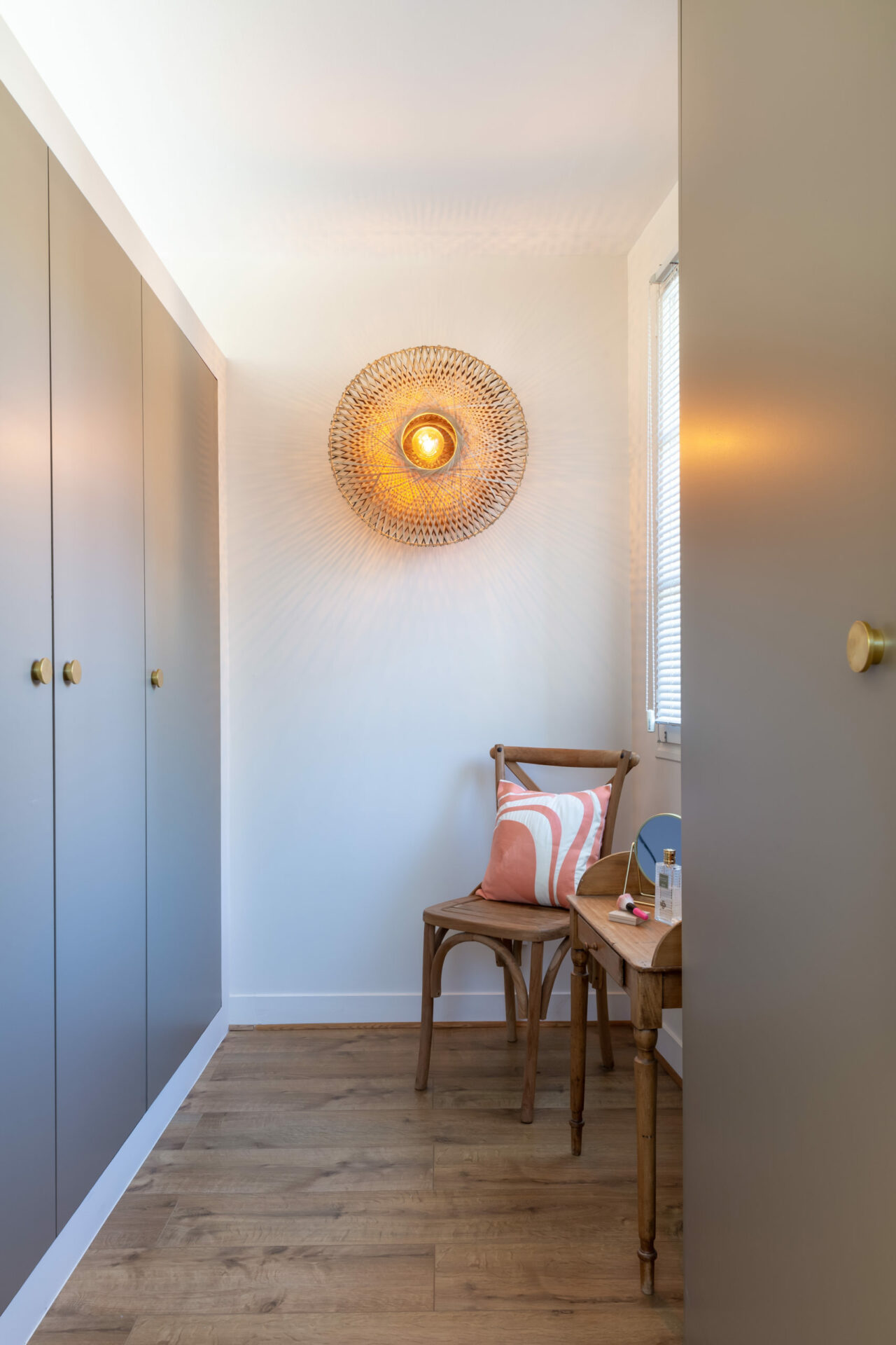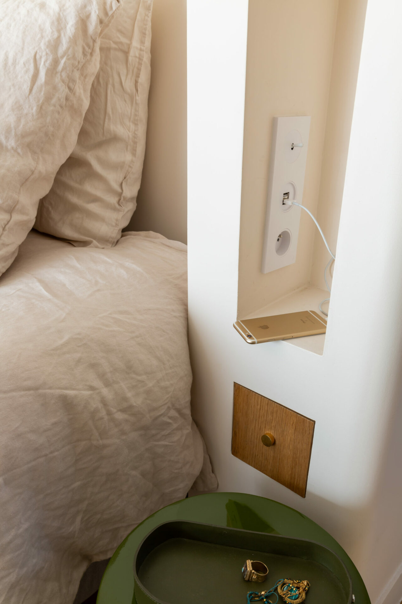 Le travail de l’architecte a été de faire entrer la lumière et adoucir l’ensemble avec des couleurs et des matières nobles et chaleureuses. Du mobilier a été créé sur mesure. Dans la suite parentale, l’idée a été d’imaginer une grande tête de lit dans le style méditerranéen qui intègre le dressing.