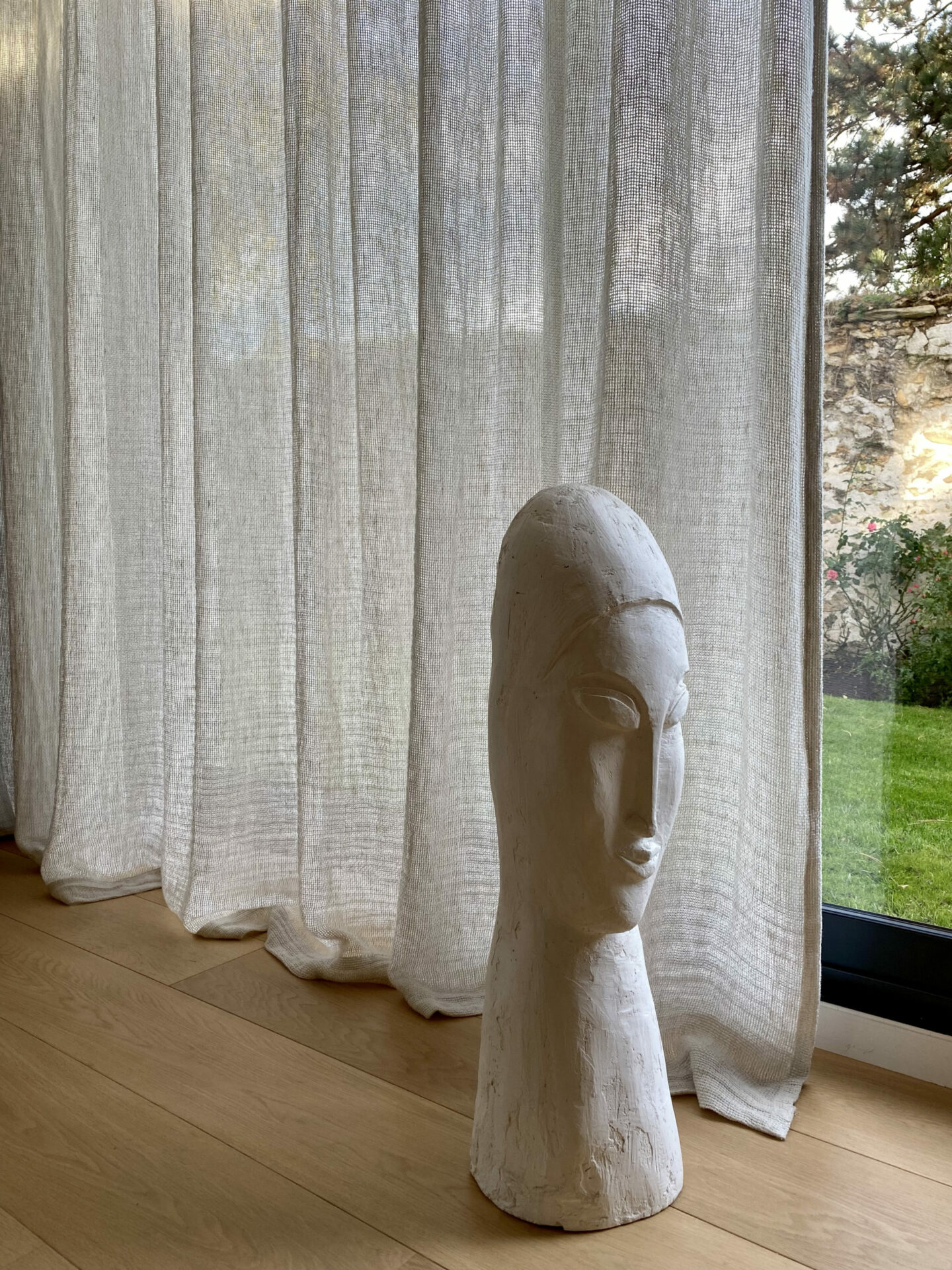 « Mes clients vivent dans une grande maison moderne aux larges baies vitrées que j’ai habillées avec des rideaux sur mesure. Le soir venu ces beaux tableaux deviennent des écrans noirs qu’il fallait habiller.