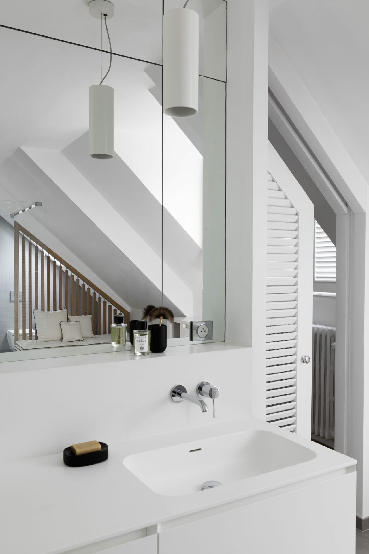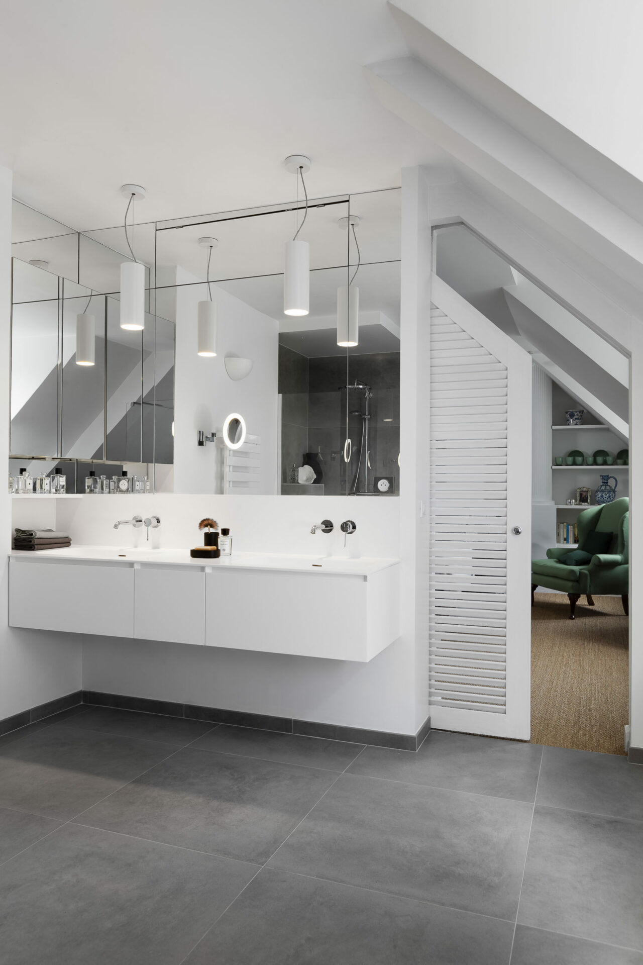 Le travail de l’architecte a été de transformer une salle de bain en une pièce de vie à part entière avec un coin repos, une vaste douche à l’italienne et des rangements sur mesure.