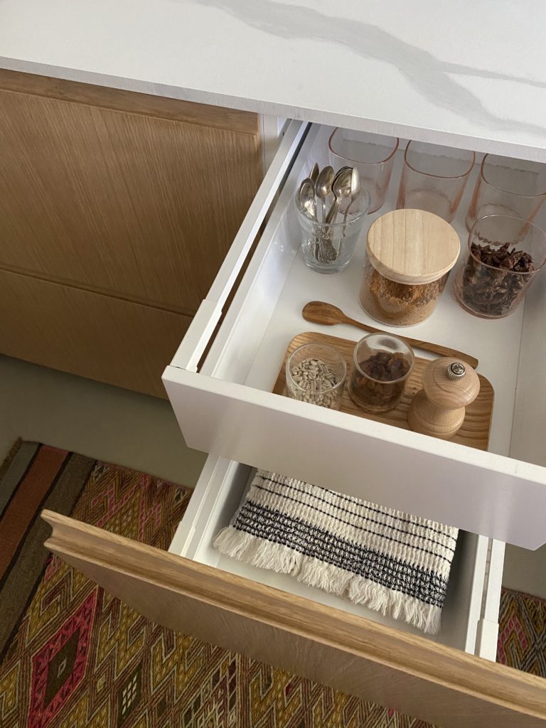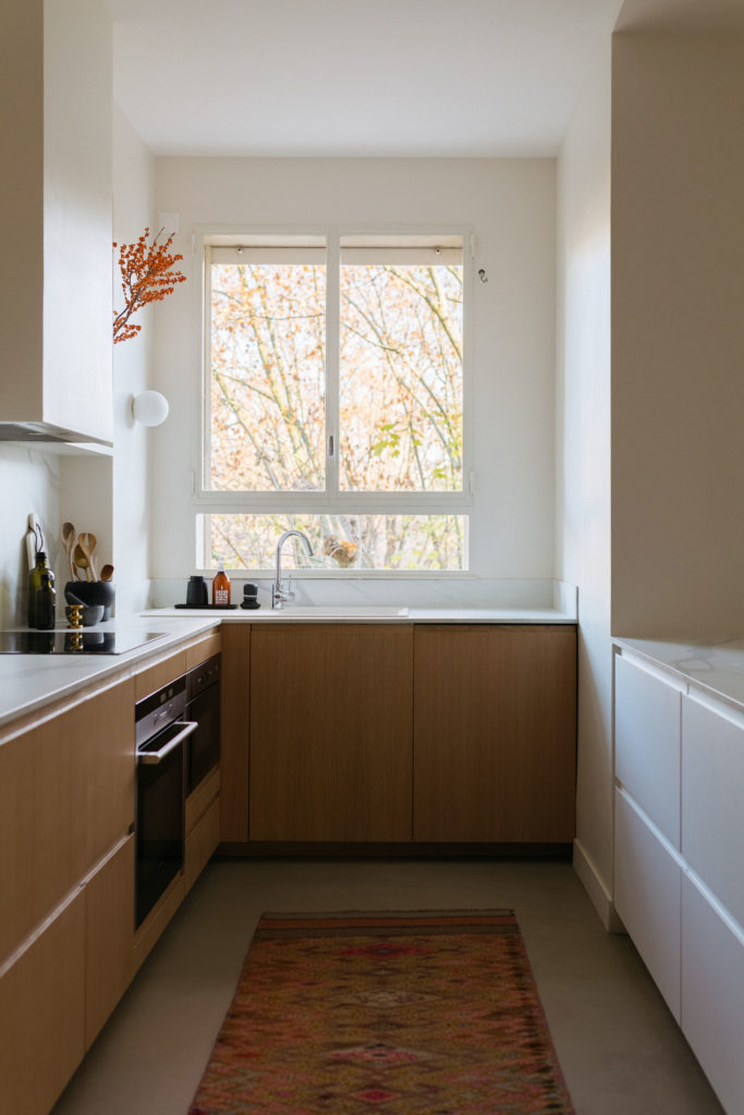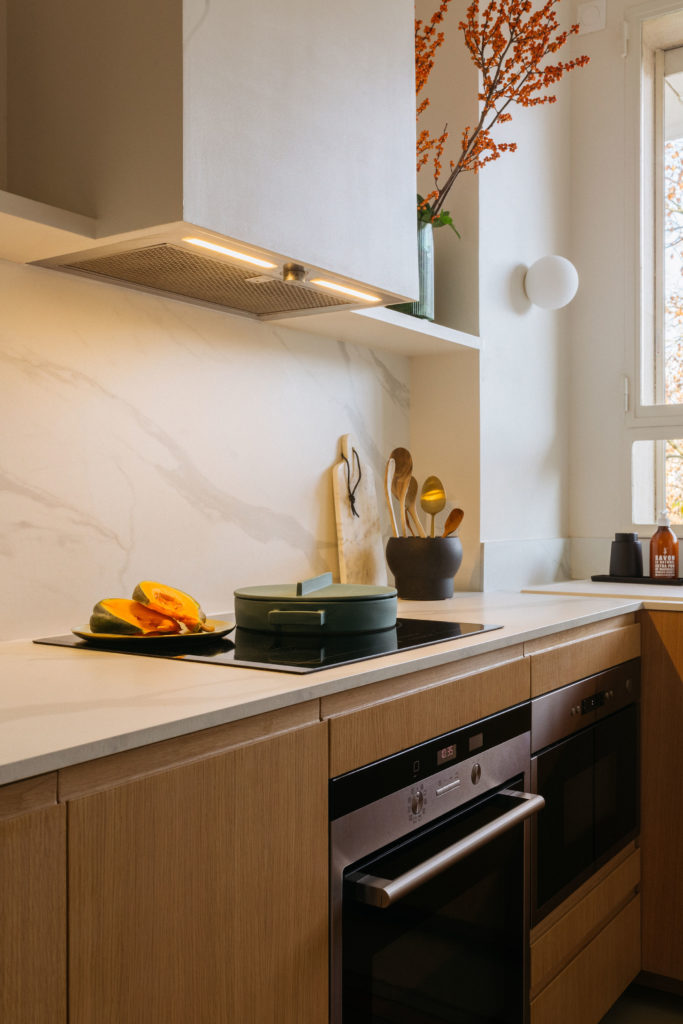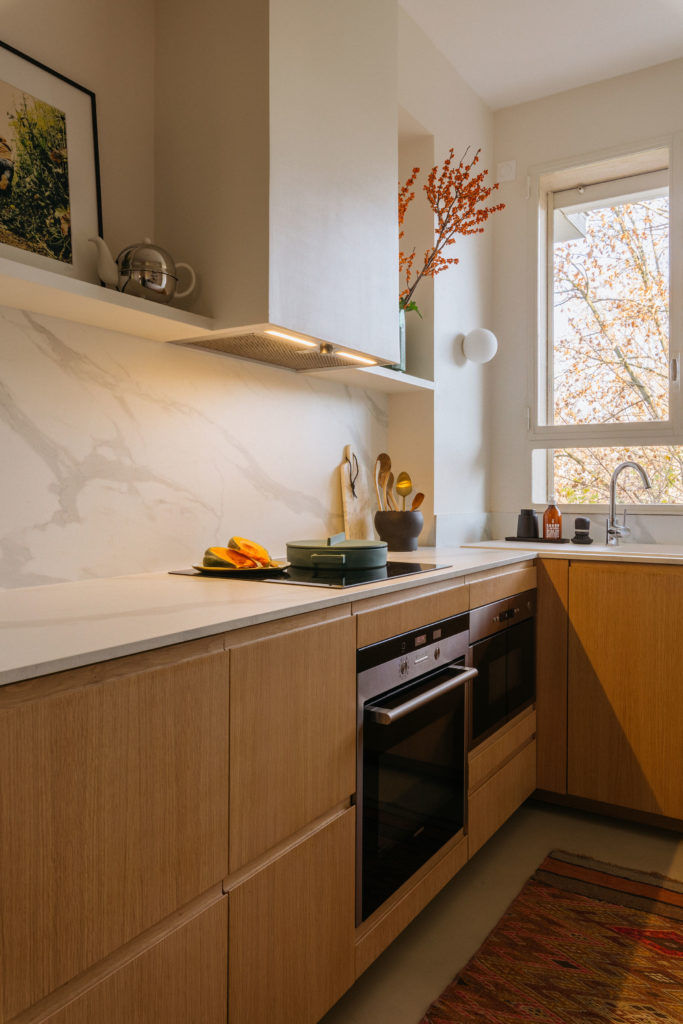 L’idée était de transformer cet espace fonctionnel sans charme en un lieu de vie chaleureux et apaisant tout en restant pratique au quotidien.