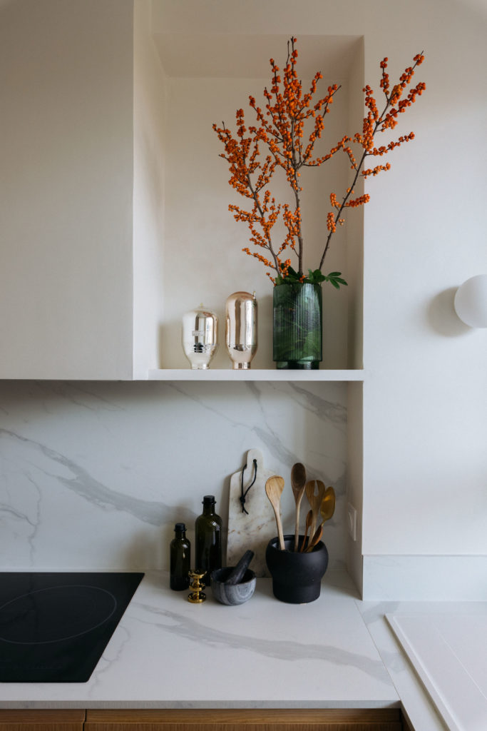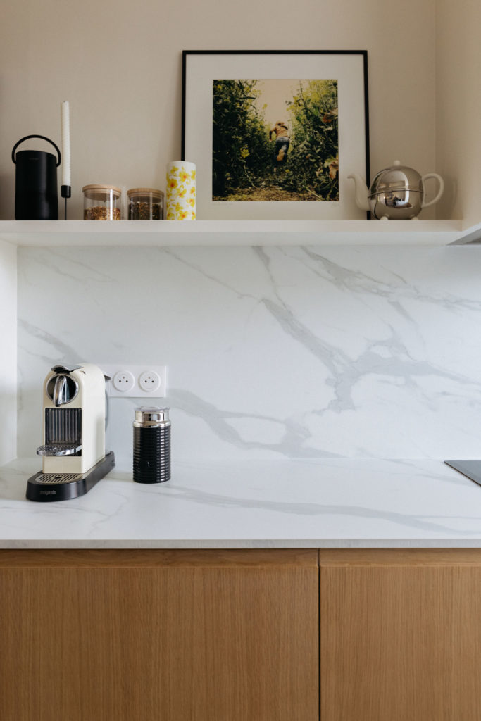On a allégé le haut de la cuisine avec des tons clairs et peu d’éléments, les étagères laissent le regard filer vers les arbres derrière la fenêtre.